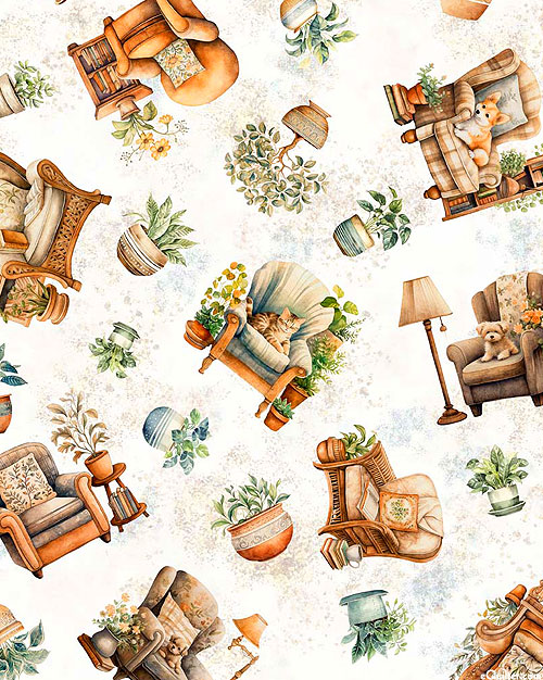 Cozy armchairs are tossed amongst a variety of house plants, with some of the armchairs being occupied by napping dogs and cats. Digitally printed, larger couches are about 3", from the 'Home Sweet Home' collection by Dan Morris for Quilting Treasures.