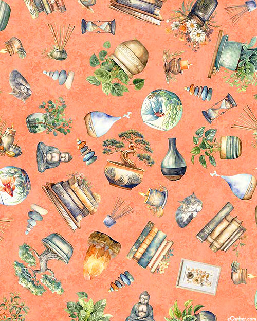 A toss of various things you would find in a peaceful home such as plants, goldfish bowls, Buddha statues, stone cairns, hourglasses, incense, sleeping kitties, bonsai trees, candles, lamps, and flowers can be found atop this unique fabric. Digitally printed, larger objects are about 2", from the 'Home Sweet Home' collection by Dan Morris for Quilting Treasures.