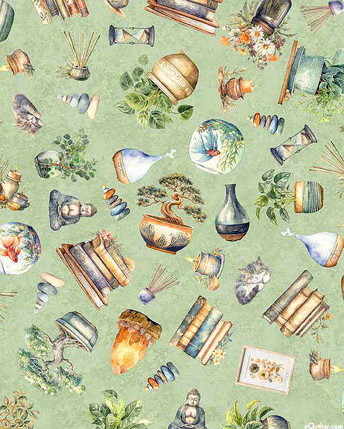 A toss of various things you would find in a peaceful home such as plants, goldfish bowls, Buddha statues, stone cairns, hourglasses, incense, sleeping kitties, bonsai trees, candles, lamps, and flowers can be found atop this unique fabric. Digitally printed, larger objects are about 2", from the 'Home Sweet Home' collection by Dan Morris for Quilting Treasures.