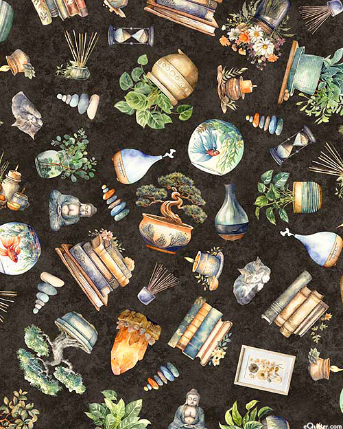 A toss of various things you would find in a peaceful home such as plants, goldfish bowls, Buddha statues, stone cairns, hourglasses, incense, sleeping kitties, bonsai trees, candles, lamps, and flowers can be found atop this unique fabric. Digitally printed, larger objects are about 2", from the 'Home Sweet Home' collection by Dan Morris for Quilting Treasures.