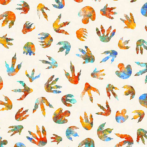Small footprints belonging a variety of prehistoric dinosaurs are tossed across a gently mottled background. Digitally printed, larger footprints are about 2-1/4", from the 'DinoROARS!' collection by Dan Morris for Quilting Treasures.