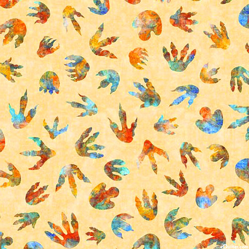 Small footprints belonging a variety of prehistoric dinosaurs are tossed across a gently mottled background. Digitally printed, larger footprints are about 2-1/4", from the 'DinoROARS!' collection by Dan Morris for Quilting Treasures.