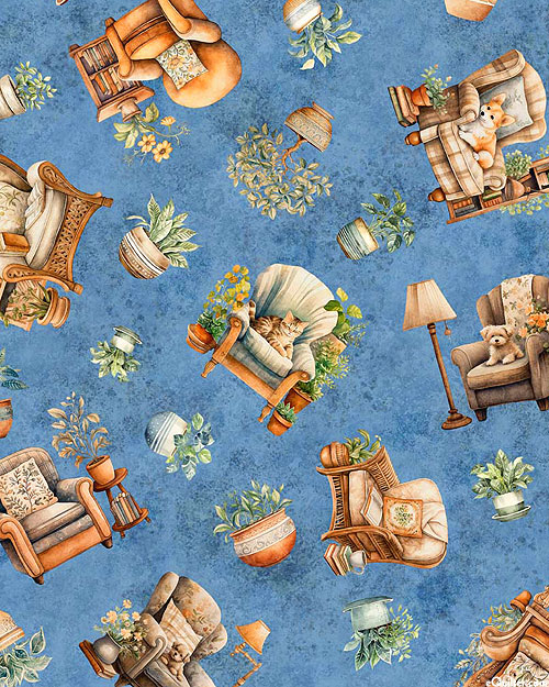 Cozy armchairs are tossed amongst a variety of house plants, with some of the armchairs being occupied by napping dogs and cats. Digitally printed, larger couches are about 3", from the 'Home Sweet Home' collection by Dan Morris for Quilting Treasures.