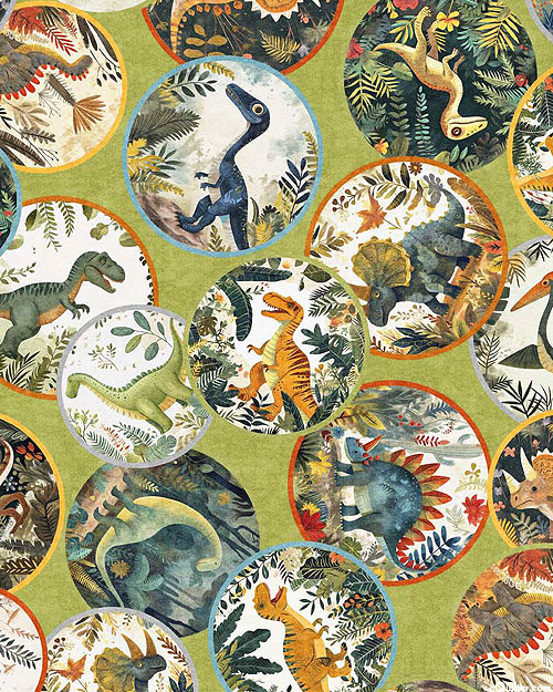 Circular portraits scattered across the design contain cute renditions of iconic dinosaurs including stegosaurus, brontosaurus, triceratops, brachiosaurus, and velociraptors. Digitally printed, larger circles are about 4-1/2", from the 'DinoROARS!' collection by Dan Morris for Quilting Treasures.