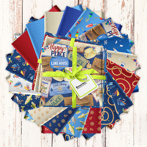 Fishing and lake motifs including fish flies, lake house signs, and rowing oars coalesce in this cozy pre-cut! 'Sail Away' collection fat quarter pack by Andi Metz for Benartex Fabrics. Pack includes eighteen fat quarters.
