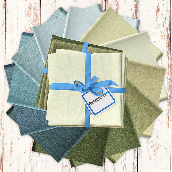 Simple solid fabrics are made interesting with a pearlescent sheen making a unique texture atop the fabric. Coming in a variety of soft colors, this pre-cut pack is versatile and can be used in a wide array of projects! 'Cotton Shot Green/Blue' collection fat quarter pack by Amanda Murphy for Benartex Fabrics. Pack includes twelve fat quarters.