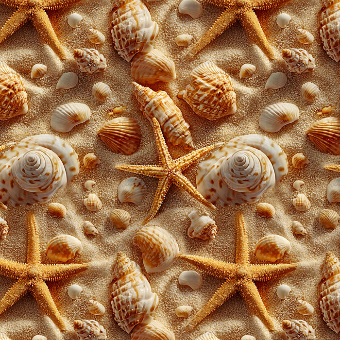 Starfish and seashells are scattered across the sand-covered ground of the beach. Digitally printed, starfish are about 3-1/2", 'Seashells on the Beach 2' by the Rubin Design Studio, designed exclusively for eQuilter.