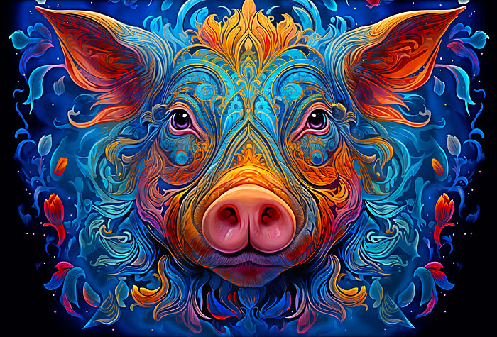 The captivating face of an intricately adorned pig emerges from delicately illustrated patterns reminiscent of those found in mandalas and zentangle designs. Digitally printed, 29" panel, 'Mysterious Piggy' by the Rubin Design Studio, designed exclusively for eQuilter.