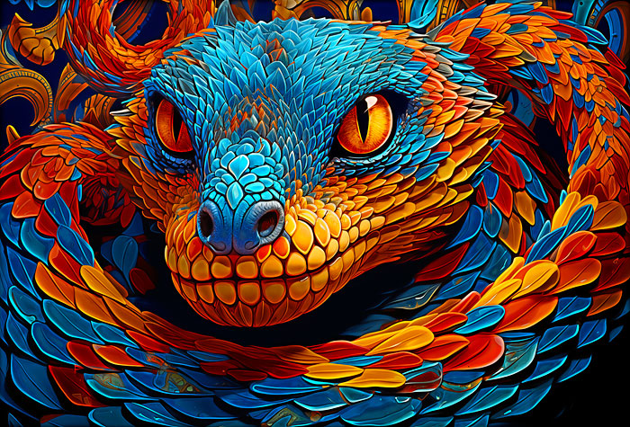 The captivating face of an intricately adorned snake emerges from delicately illustrated patterns reminiscent of those found in mandalas and zentangle designs. Digitally printed, 29" panel, 'Mystic Snake' by the Rubin Design Studio, designed exclusively for eQuilter.