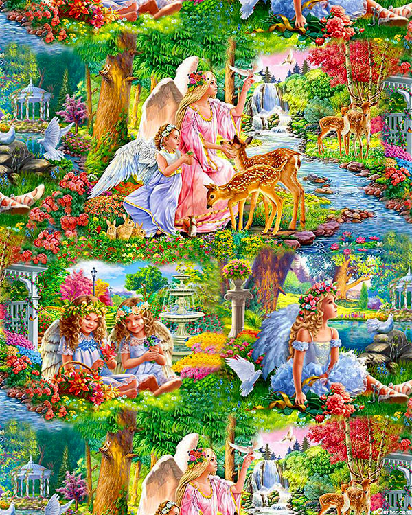 A serene scene featuring angelic figures comes to life amidst a heavenly forest filled with lush florals, wild animals, gazebos, and water fountains. Larger scenes are about 6-3/4", 'Angels Scenic' from the 'Angels' collection by Image World Courtesy of MHS Licensing for Sykel Enterprises.