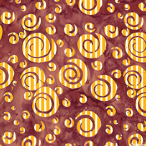 A pleasant scatter of swirly shapes that dance in the air are depicted in vivid hues within mottled batik textures. Batik, larger spirals are about 2", from the 'Cinnamon Tree' collection by Banyan Batiks for Northcott Fabrics.
