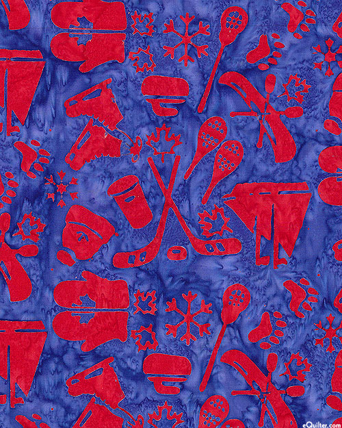 Hockey-themed motifs are depicted in vivid hues within mottled batik textures. Batik, hockey sticks are about 3-1/2", from the 'Outdoor Adventure' collection by Banyan Batiks for Northcott Fabrics.
