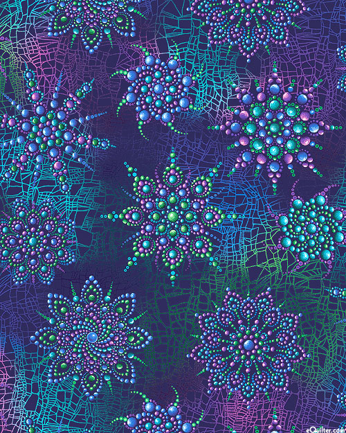 Elegant beaded medallions are reminiscent of mandalas and dance across a uniquely textured background of misty colors and lines. Larger medallions are about 3-1/4", 'Cirrus Beaded Medallion' from the 'On Dragonfly Wings' collection by Ann Lauer of Grizzly Gulch Gallery for Benartex Fabrics.