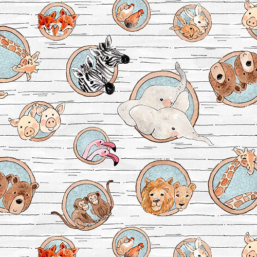 "They came into the ark with Noah two by two". Various pairs of animals aboard Noah's ark are seen peering out the windows of the ark including zebras, elephants, bears, chickens, foxes, giraffes, pigs, rabbits, flamingos, monkeys, andlions. Larger elephants are about 2", from the 'Two By Two' collection by by Caverly Smith for 3 Wishes Fabric.