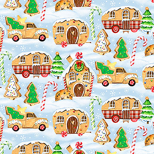 A cozy collection of gingerbread cookie campers are decorated in candy canes, peppermint candies, and festive frosting. Larger gingerbread houses are about 3", 'Gingerbread Camping' by 3 Wishes Fabric.