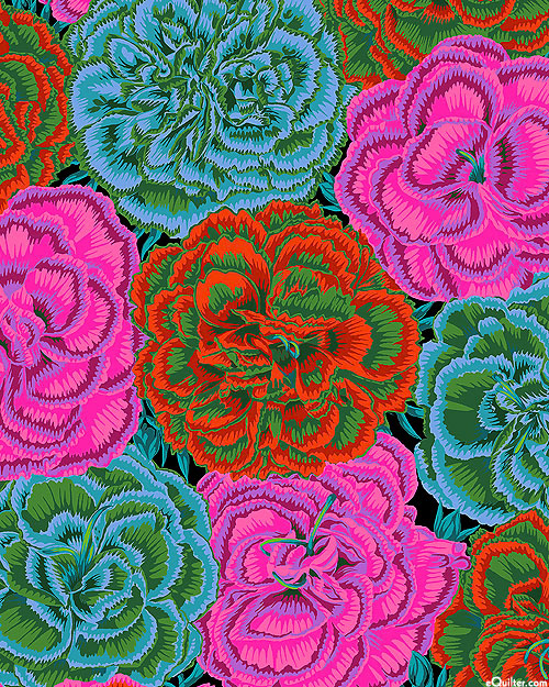 Picotee carnation blooms are depicted in a striking palette of rich and vivid hues. Larger flowers are about 6-3/4", 'Picotee Carnations' from the 'August 2025 Kaffe Fassett Collective' collection by Philip Jacobs for Free Spirit.