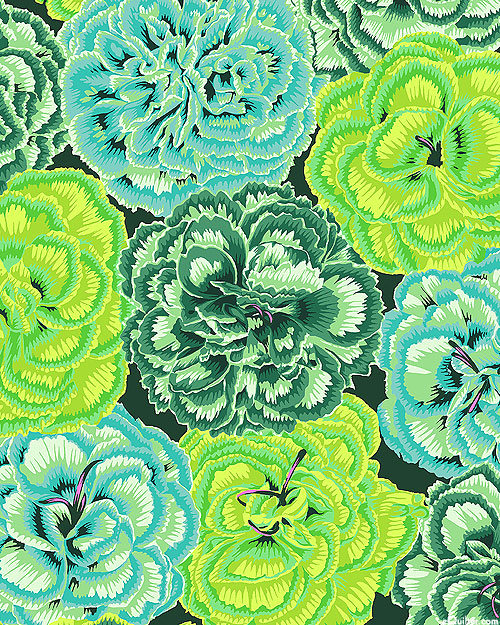 Picotee carnation blooms are depicted in a striking palette of rich and vivid hues. Larger flowers are about 6-3/4", 'Picotee Carnations' from the 'August 2025 Kaffe Fassett Collective' collection by Philip Jacobs for Free Spirit.