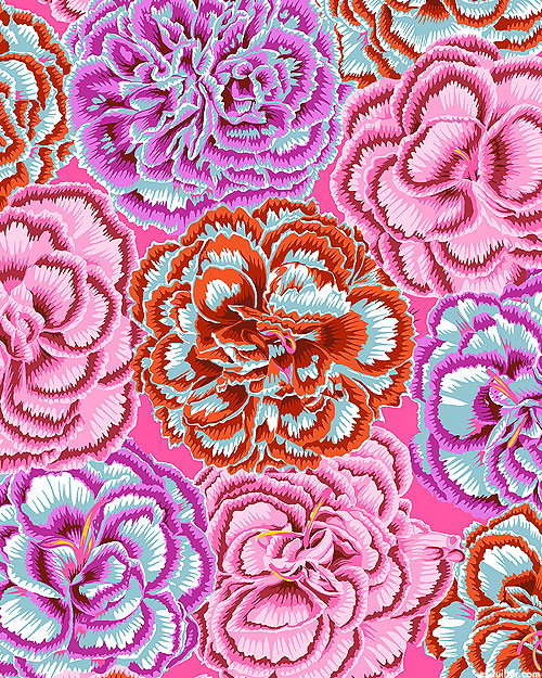 Picotee carnation blooms are depicted in a striking palette of rich and vivid hues. Larger flowers are about 6-3/4", 'Picotee Carnations' from the 'August 2025 Kaffe Fassett Collective' collection by Philip Jacobs for Free Spirit.