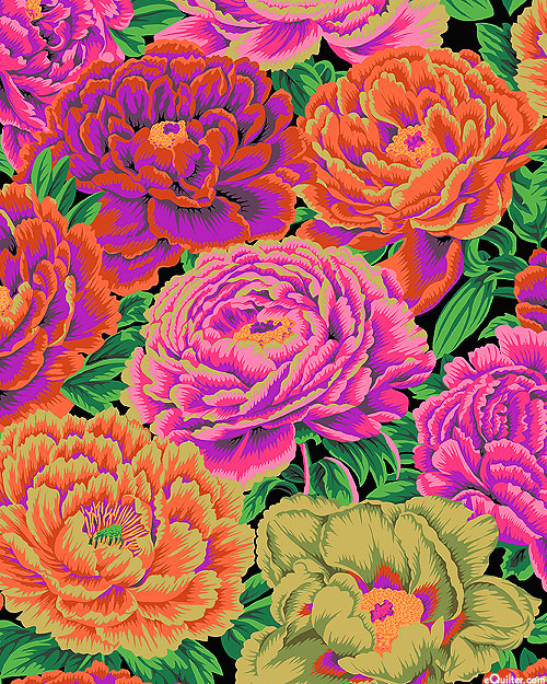 Bold peony blooms are depicted in a striking palette of rich and vivid hues. Larger flowers are about 8", 'Tibetan Peony' from the 'August 2025 Kaffe Fassett Collective' collection by Philip Jacobs for Free Spirit.