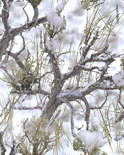 A perfect depiction of desert plants and foliage during the winter season, this print includes sagebrush and prairie grasses found in the diverse vegetation of mountain deserts and rocky terrain. Wider trees are about 1 1/2", 'Mc2 Snow' © by True Timber Outdoors for Springs.