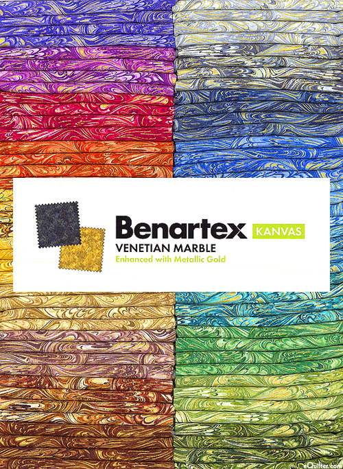 A striking pattern of Venetian marble is presented in a variety of vivid colors, making a versatile pre-cut that can be used in a wide array of projects! 'Venetian Marble' collection fat quarter box by Kanvas Studio for Benartex Fabrics. Pack includes eighty fat quarters. With gold metallic.