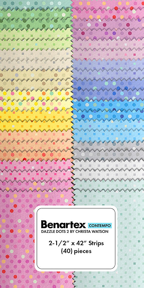 Beautiful pastels are accompanied by a plethora of little dots, adding a fun flair to the squares' designs. 'Dazzle Dots 2' collection strip pack by Christa Watson for Benartex Fabrics, pack includes forty 2-1/2" x 42" strips.