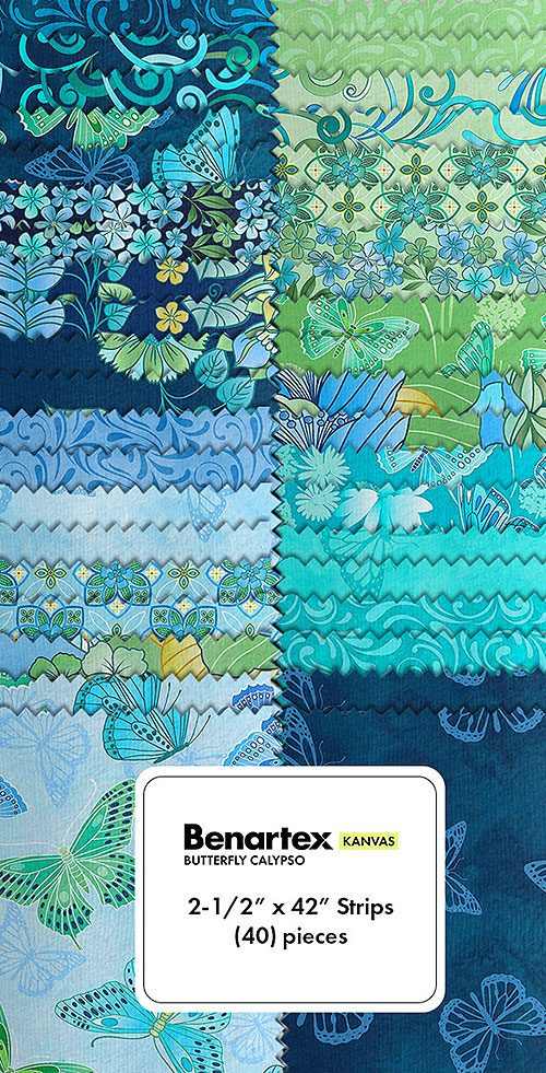 Elegant butterflies come together with a collection of lush garden motifs to create a captivating pre-cut full of bliss. 'Butterfly Calypso' collection strip pack by Benartex Fabrics, pack includes forty 2-1/2" x 42" strips.