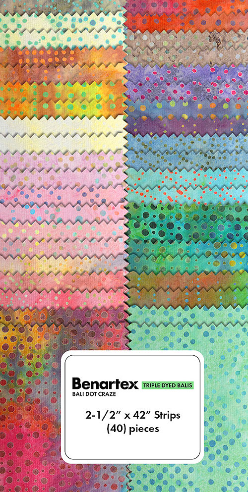 A simple dotted pattern is presented in a variety of vivid colors, making a versatile charm pack that can be used in a wide array of projects! 'Bali Dot Craze' collection strip pack by Benartex Fabrics, pack includes forty 2-1/2" x 42" strips.