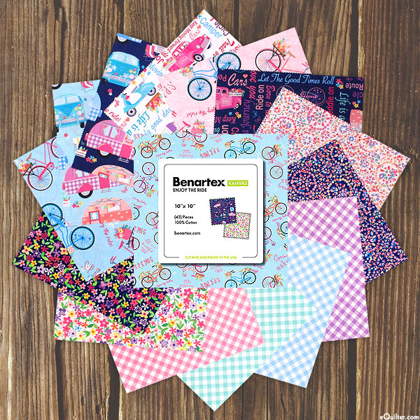 A collection of vintage vehicles, gingham checks, and radiant florals coalesce in this charming pre-cut. 'Enjoy The Ride' collection ten-square, by Benartex Fabrics. Pack includes forty-two 10" x 10" squares.