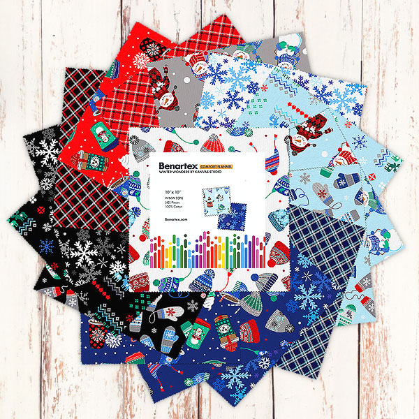 Festive motifs full of winters charm coalesce in this delightful pre-cut! 'Winter Wonders' collection ten-square, by Benartex Fabrics. Pack includes forty-two 10" x 10" flannel squares.