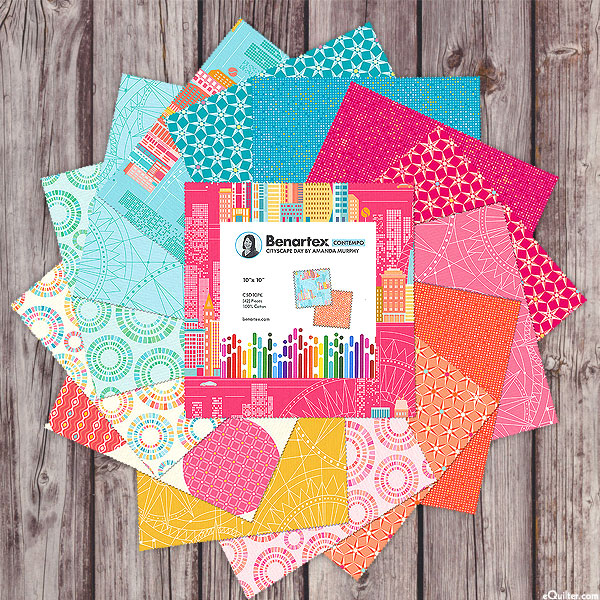 Depictions of a concrete jungle during the day are accented by lively patterns full of energy in this fun pre-cut. 'Cityscape Day' collection ten-square, by Amanda Murphy for Benartex Fabrics. Pack includes forty-two 10" x 10" squares.