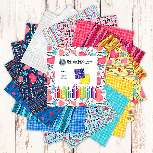 A collection of fun designs containing wholesome words of encouragement come together in this uplifting pre-cut. 'Upwords' collection ten-square, by Kimberley Einmo for Benartex Fabrics. Pack includes forty-two 10" x 10" squares.