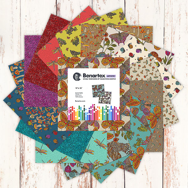 This charming pre-cut features an assortment of small wonders from the forest floor including mushrooms, frogs, butterflies, snails, and dragonflies. 'Small Wonders' collection ten-square, by Valentina Harper for Benartex Fabrics. Pack includes forty-two 10" x 10" squares.