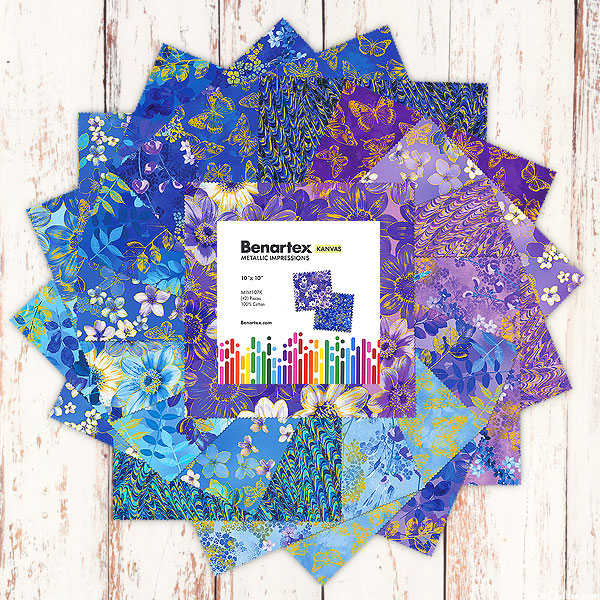 Lush and leafy florals and elegant butterflies coalesce in this majestic pre-cut! 'Metallic Impressions' collection ten-square, by Benartex Fabrics. Pack includes forty-two 10" x 10" squares. With gold metallic.