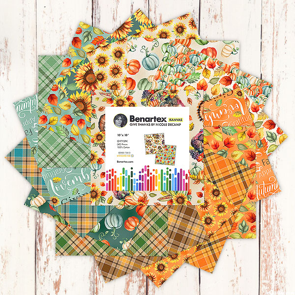 This harvest-themed pre-cut features a variety of Autumnal motifs including pumpkins, sunflowers, changing leaves, and cozy plaids. 'Give Thanks' collection ten-square, by Nicole DeCamp for Benartex Fabrics. Pack includes forty-two 10" x 10" squares.