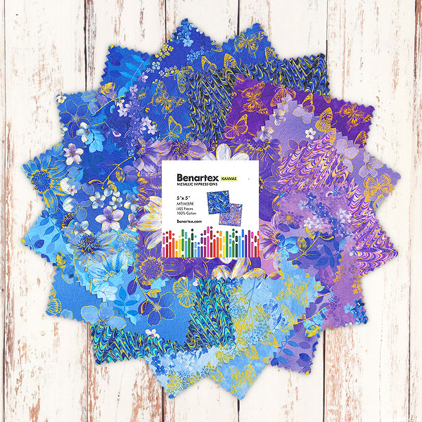 Lush and leafy florals and elegant butterflies coalesce in this majestic pre-cut! 'Metallic Impressions' collection charm pack by Benartex Fabrics, pack includes forty-two 5" x 5" squares. With gold metallic.
