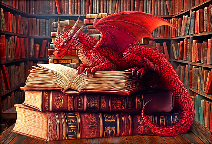 A scholarly dragon rests atop a stack of tomes as he studies and reads in the pursuit of knowledge. Digitally printed, 29" panel, 'Ancient Dragon Scholar' by the Rubin Design Studio, designed exclusively for eQuilter.