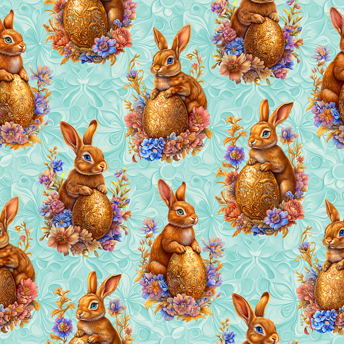 Playful bunny rabbits perch on golden Easter eggs hidden in the grass of a flowery garden. Digitally printed, Easter bunnies are about 4", 'Easter Bunnies Allover' by the Rubin Design Studio, designed exclusively for eQuilter.
