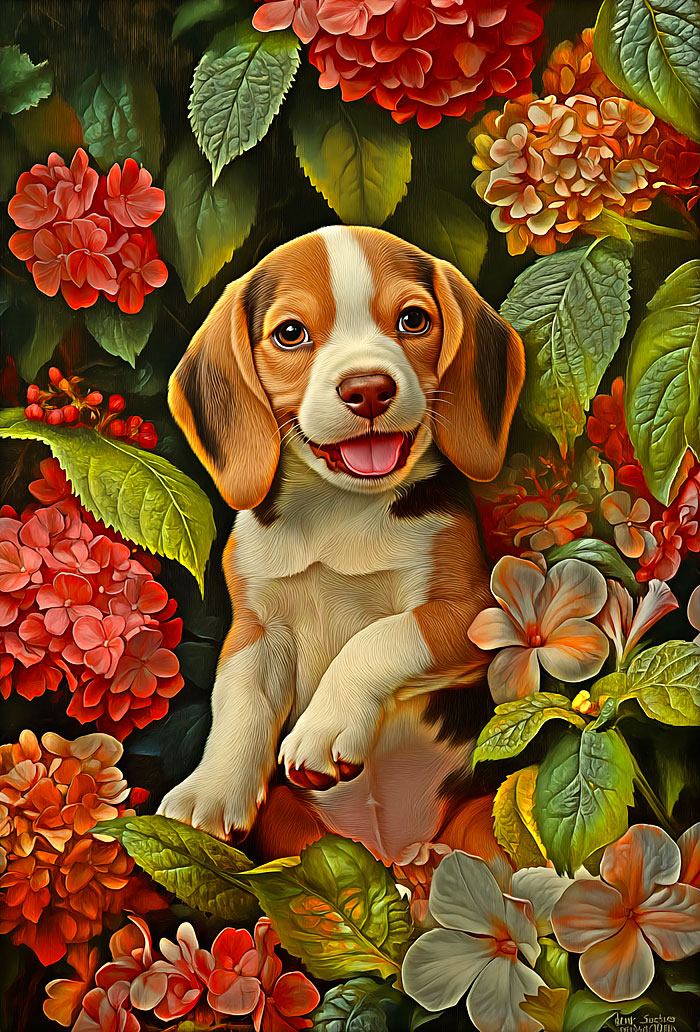 A playful Beagle puppy pokes their head through the verdant foliage of the forest in this cute and cuddly panel. Digitally printed, 29" panel, 'Puppy Heaven Beagle' by the Rubin Design Studio, designed exclusively for eQuilter.