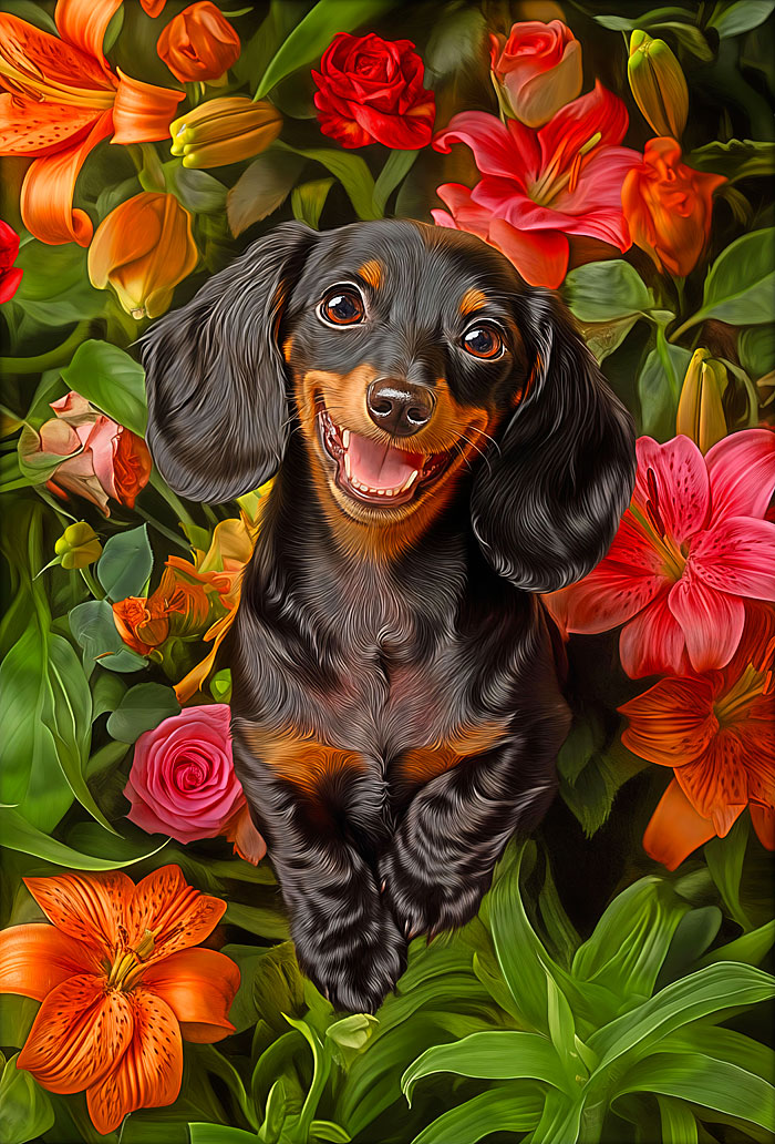 A playful Dachshund puppy pokes their head through the verdant foliage of the forest in this cute and cuddly panel. Digitally printed, 29" panel, 'Puppy Heaven Dachshund' by the Rubin Design Studio, designed exclusively for eQuilter.