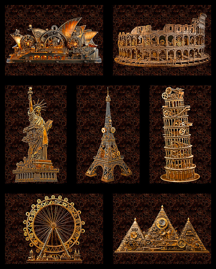 Depicted against a background of rusty gears are a vibrant variety of monuments decorated in a mesmerizing assortment of metallic and mechanical steampunk gear including the Eiffel Tower, the Leaning Tower of Pisa, the Colosseum, the Statue of Liberty, the Sydney Opera House, and the London Eye. Digitally printed, 35" panel, 'Steampunk City Icons Panel' by the Rubin Design Studio, designed exclusively for eQuilter.