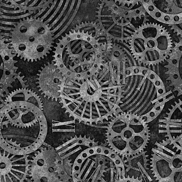 Antique, weathered Roman numerals form shapes reminiscent of a clocks around assorted, overlapping gears. 108" wide quilt backing, digitally printed, larger gears are about 2-1/2", 'Steampunk Gears' by the Rubin Design Studio, designed exclusively for eQuilter.