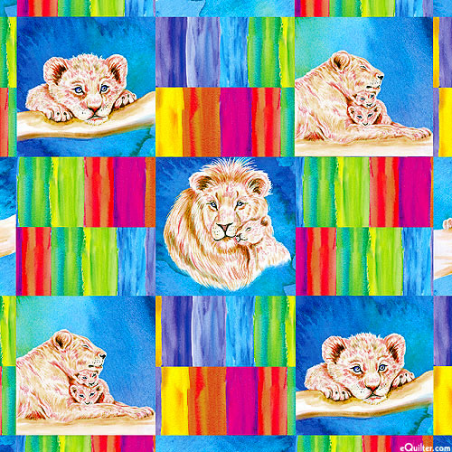 A family of lions are depicted in the blocks between strips of a rainbow of painterly textures and vivid hues. Larger squares are about 2-1/2", 'Lion Rainbow' from the 'Starlight Safari' collection by Lorraine Turner for Benartex Fabrics.