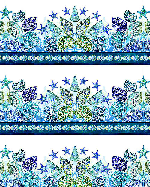 Layered between the stripes of this oceanic design are a collection of seashells neatly arranged into an ornate display of aquatic elegance. Wider stripes are about 9", stripes run the length of the fabric, from the 'Wonders Of The Ocean' collection by Jason Yenter for In The Beginning Fabrics.
