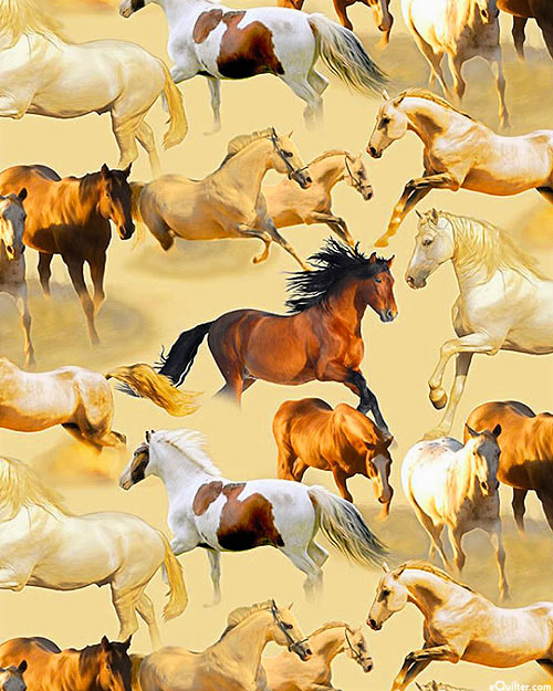 Wild horses gallop across the design in a majestic expression of nature's beauty. Larger horses are about 3", 'Running Free' from the 'Western Rodeo' collection by Kate Ward Thacker for Springs.
