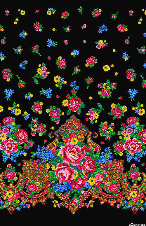 Eastern European folk traditions glow with life in this flowery single border print! Single border print, from the 'Kokum Scarf (Babushka)' collection by Elizabeth's Studio.