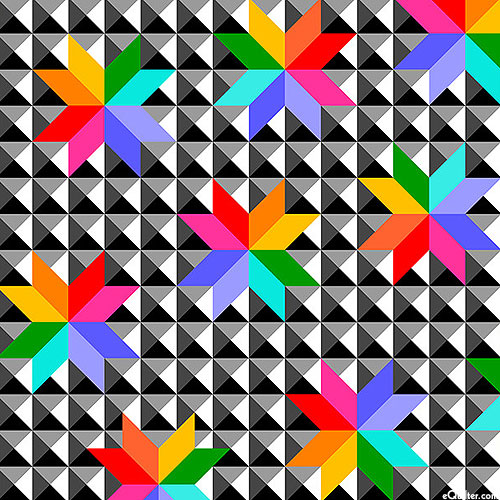 A mesmerizing mosaic of colorful floral shapes stand out against a grayscale background of square tiles. Please prewash and allow for up to 7% shrinkage. Digitally printed, 108" wide quilt backing, stars are about 3-1/4", 'Charisma Blocks' from the 'Extra Wide Backings' collection by Charisma Horton for Timeless Treasures.