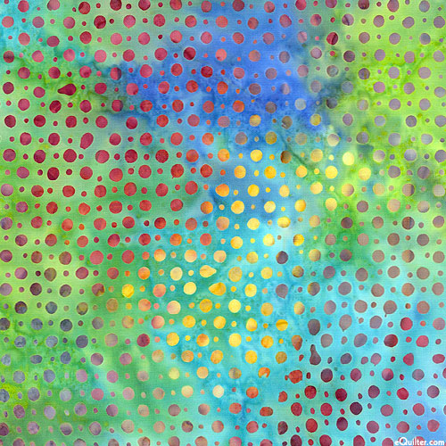 Juicy and vividly hued dots tumble over an atmospheric ground in this abstract batik. Batik, larger dots are about 1/4", 'Big Little Dot' from the 'Bali Dot Craze' collection by Benartex Fabrics.