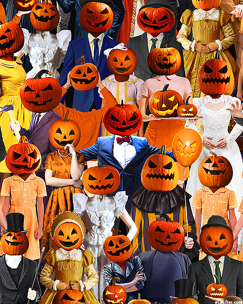 People wearing various Halloween costumes wear creepy jack o' lantern masks carved with dark and sinister faces. Digitally printed, taller figures are about 5-1/2", 'Jack O' Lantern Costume' from the 'All Hallows' Eve' collection by Timeless Treasures.