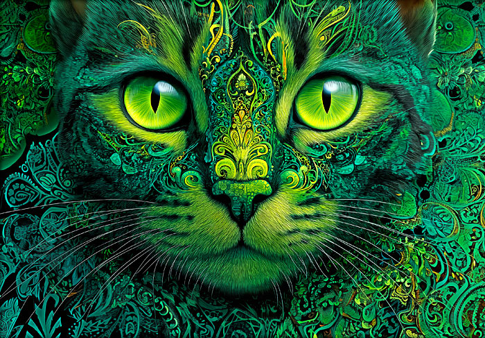 The captivating face of an intricately adorned cat emerges from delicately illustrated patterns reminiscent of those found in mandalas and zentangle designs. Digitally printed, 29" panel, 'Emerald Kitty' by the Rubin Design Studio, designed exclusively for eQuilter.